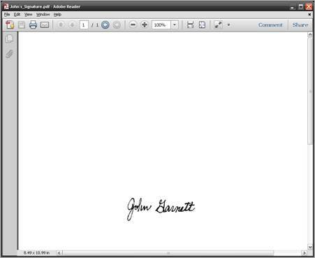 Open the scanned page PDF file with Adobe Acrobat or Adobe Reader. Should you not have either of these applications, Adobe Reader is a free download (http://get.adobe.com/reader/). Download and install the Adobe Reader software and open the scanned page PDF file. An example of a scanned signature opened within Adobe Reader X is shown below. |