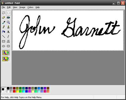 An untitled Paint window will open. Paste the previously copied signature into Paint by selecting Edit è Paste or using the Ctrl + V keyboard shortcut. Do not be too concerned that the signature appears larger than you expected. Also do not be too concerned if there seems to be too much white space around the signature. However, if you accidentally cropped some of the signature, return to Adobe Acrobat or Adobe Reader and re-copy the signature. |